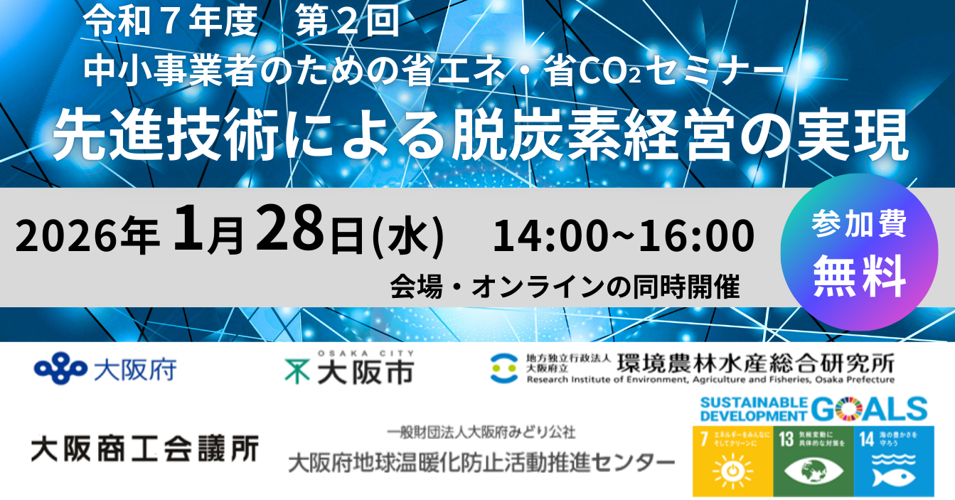 このたび、おおさかスマートエネルギーセンター(大阪府・大阪市)、地方独立行政法人大阪府立環境農林水産総合研究所、大阪商工会議所と共同で、「先進技術による脱炭素経営の実現」をテーマとして、「中小事業者のための省エネ・省CO2セミナー」を開催します。